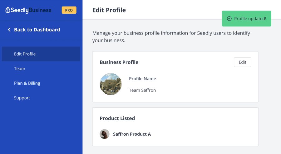 You can edit your Verified Business Profile from your SeedlyBusiness Dashboard.