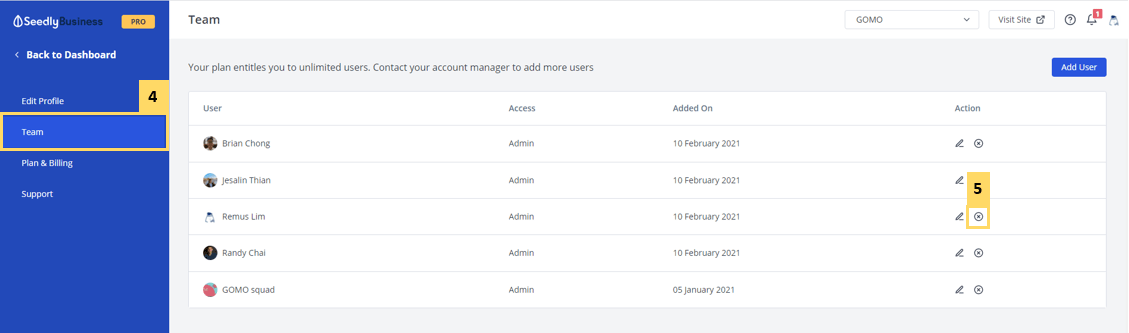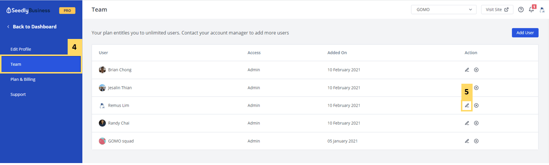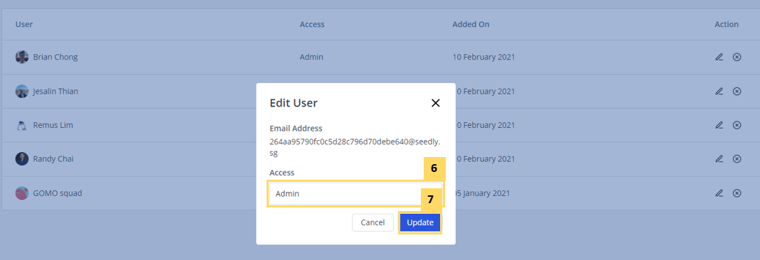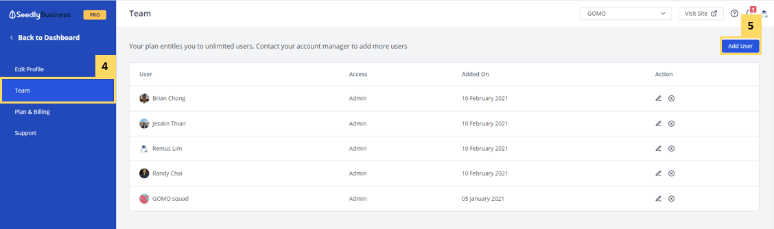 You can add, edit and remove users from your SeedlyBusiness Dashboard. All users must sign up for a Seedly User Profile on www.seedly.sg before they can be added.
