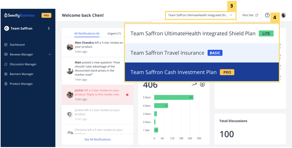 - Click onto the dropdown box on the sticky header at the top of your SeedlyBusiness Dashboard to toggle to your selected Product Page Dashboard